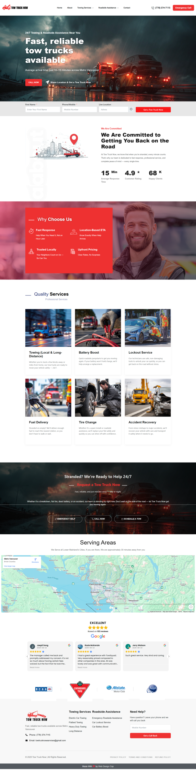🔍 SEO Optimization: Executed robust local SEO tactics targeting keywords like “tow truck Vancouver” and related suburbs to rank in emergency towing searches.